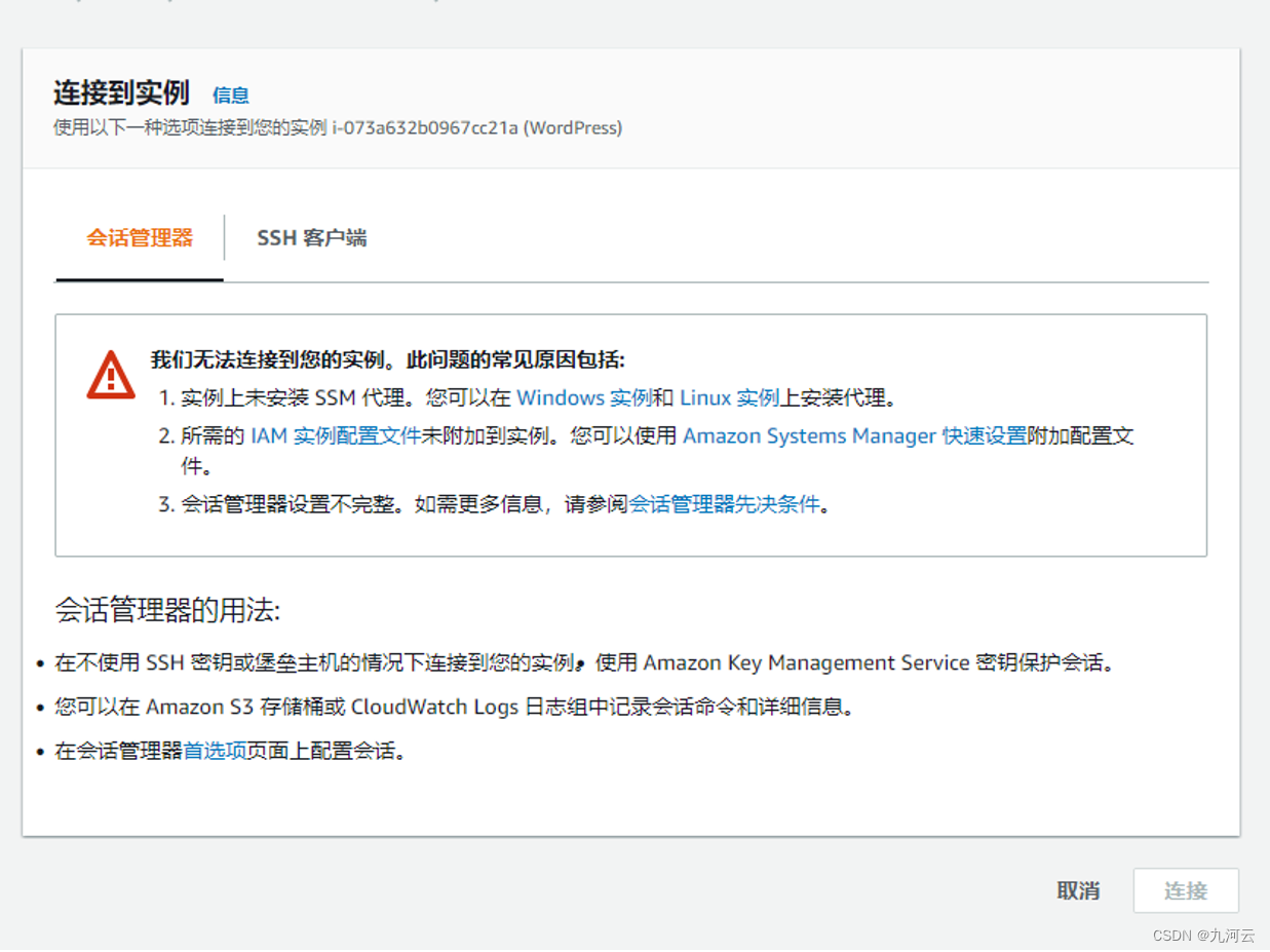 1.选中想要连接的 EC2 实例,点击页面顶部的“连接”按钮,您可以看到提供了两种连接 EC2 的方式,分别为 SSH 客户端和会话管理器。