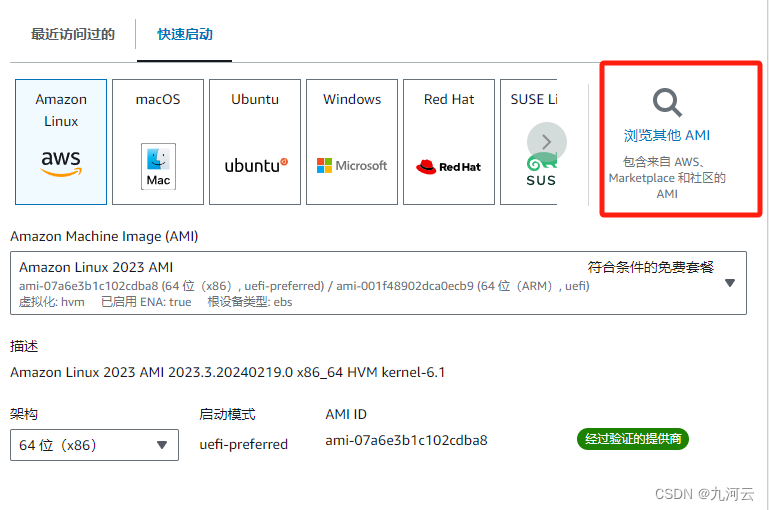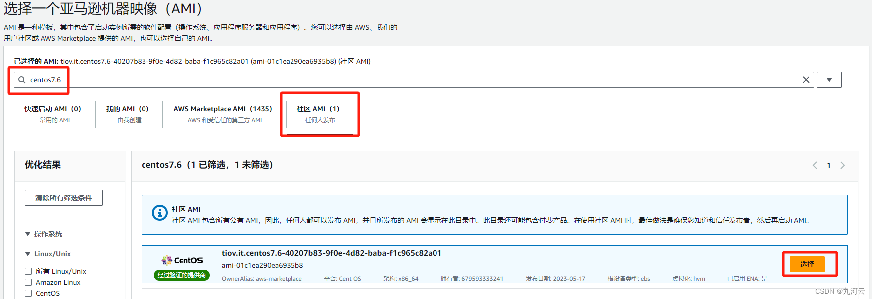 在搜索框输入对应系统版本,建议选择经过验证提供商的AMI镜像
