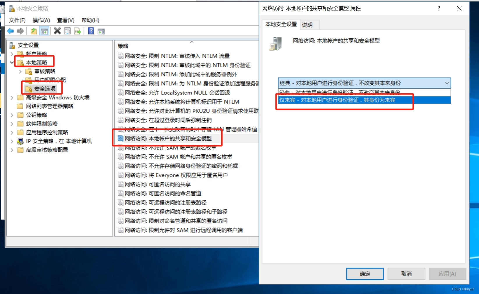 打开本地安全策略===》本地策略===》安全选项===》本地账户共享和安全模型===》设置为仅来宾
