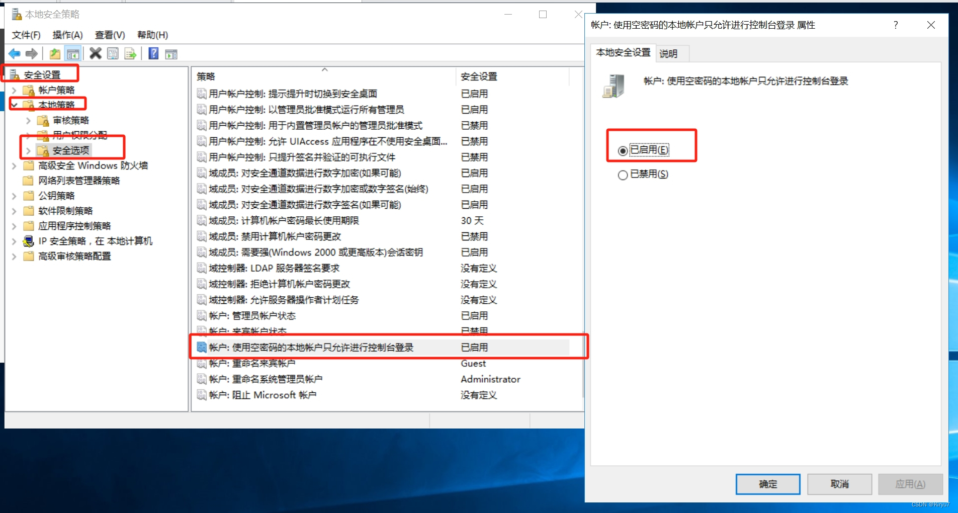 打开本地安全策略===》本地策略===》安全选项===》使用空密码的本地账户只允许进行控制台登录===》点击已启用
