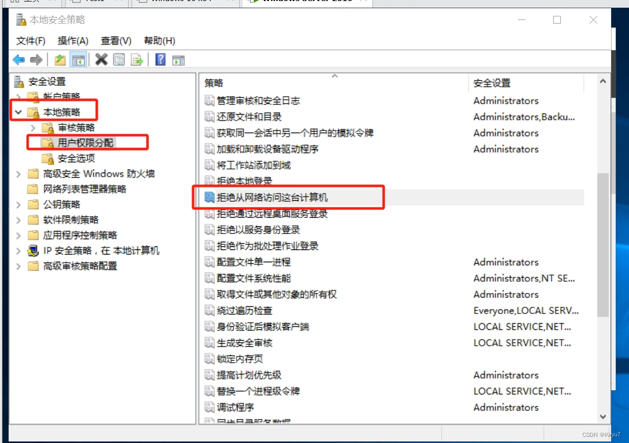 打开本地安全策略===》本地策略===》用户权限分配===》拒绝从网络访问这台计算机