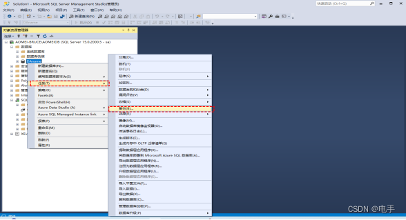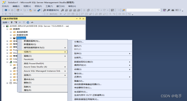 1. 启动SQL ServerManagement Studio 并连接到您要备份的实例。然后右键单击特定数据库,选择“任务”>“备份”。