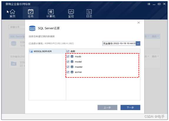 2. 选择要恢复的计算机和特定数据库,然后单击“下一步”。