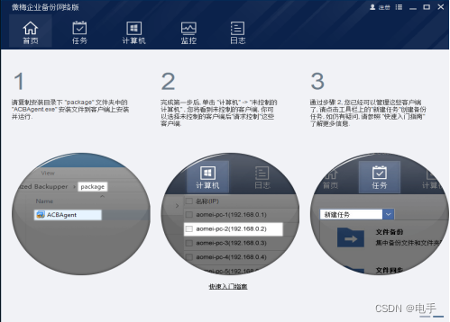 在中心机上安装傲梅企业备份网络版,在客户端计算机上安装代理包。