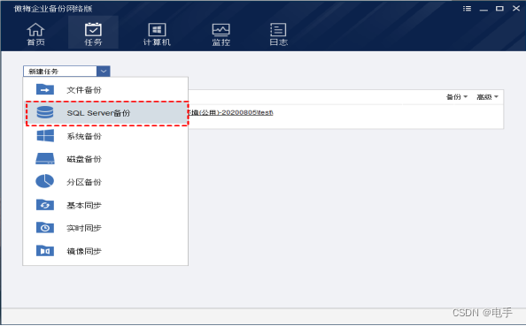 1. 选择"SQL Server备份" 选项卡,或从"任务"选项卡中的"新任务"下拉菜单中选择。