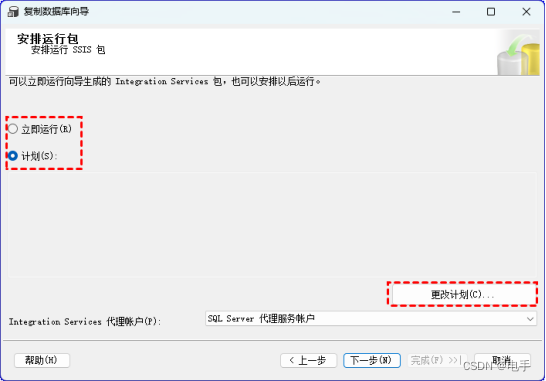 5. 为您要传输的每个数据库配置目标,然后您可以配置此向导创建的集成服务包,选择“立即运行”,或“设置计划”定期运行。