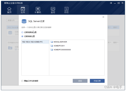 SQL Server Management Studio 为您提供将SQL Server数据库从 bak 文件还原到另一台服务器的选项,或直接将数据库移动/复制到另一台服务器。但是如果你想同时管理多个数据库(包括系统数据库),傲梅企业备份网络版的SQL Server备份功能会是一个更简单的选择。