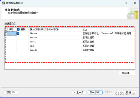 4. 选择您要传输的数据库。您还可以选择“移动”或“复制”数据库。