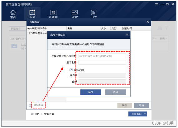 4. 在步骤 3 中选择目标路径。单击“添加存储”以添加共享或 NAS 设备作为存储端。然后你可以选择一个特定的路径来存储这个备份。单击“确定”确认设置,然后单击“开始备份”。