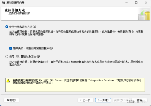 3. 选择传输方式。分离“和附加模式”更安全,但需要源数据库下线。最适合升级数据库或移动非常大的数据库。SQL 管理对象方法速度较慢,但数据库可以保持在线。