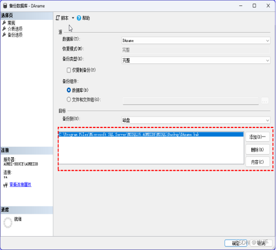 2. 确保备份类型为完整备份,然后选择目的地。默认情况下,备份文件将保存在 C:\Program Files\Microsoft SQL Server\(实例名称)\MSSQL\Backup 中。您也可以“删除”它并“添加”另一个更容易找到的路径。单击“确定”执行备份。