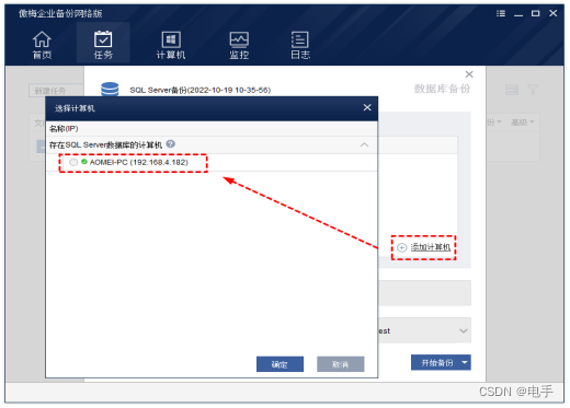 2. 在第 1 步中,单击+ 添加计算机以检测所有受控计算机。带有SQL Server数据库的客户端计算机将显示在弹出窗口中。选择您要备份的那个,然后单击“确定”。