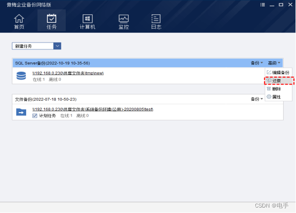 1. 在“任务”选项卡下找到创建的SQL Server数据库备份任务。单击其右上角的“高级”并选择"还原”。