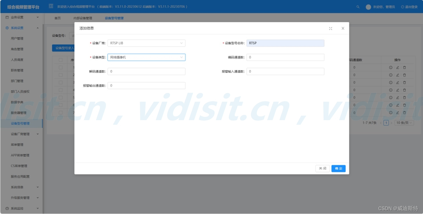 登录视频管理平台,点击系统设置的设备型号管理。点击设备型号录入。设备厂商下拉选择RTSP LIB,设备型号名称填写RTSP,设备类型选择网络摄像机后确定即可完成录入。