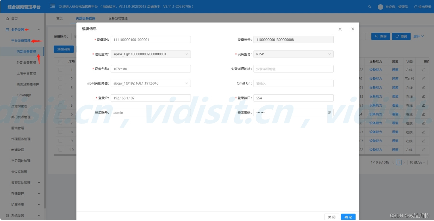 前端设备需要支持RTSP接入并打开,平台才可以使用内部设备管理的RTSP接入方式接入该设备并观看。