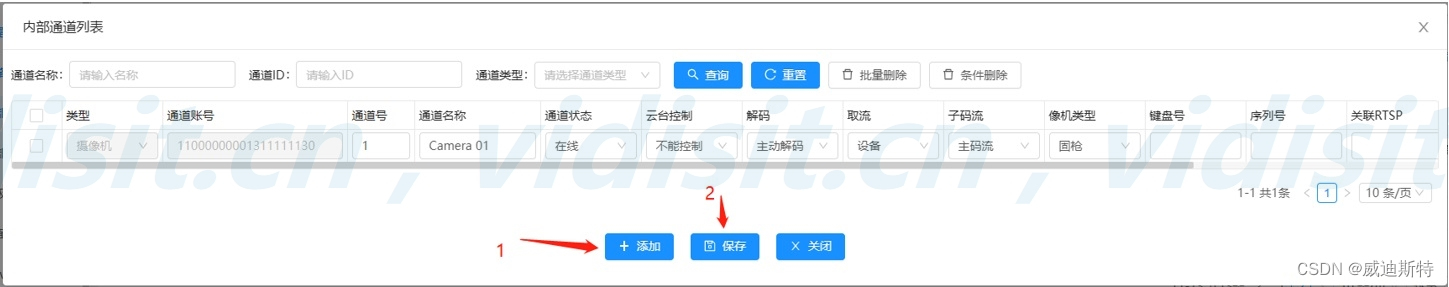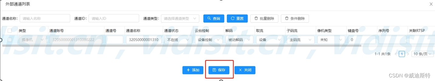 如下图,在刚才填写好的设备中,点击通道,等待NVR全部通道同步过来并确认在线后,点击保存。