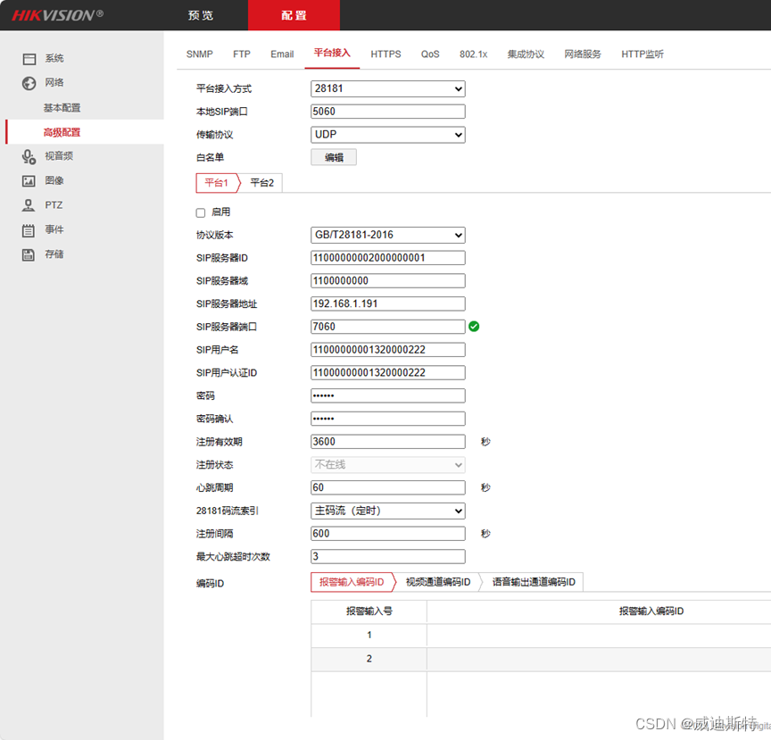 登录NVR的管理端,进入配置页面并选择网络下面的高级配置,选择平台接入。平台接入方式选择28181,本地sip端口和传输协议一般情况下默认即可。