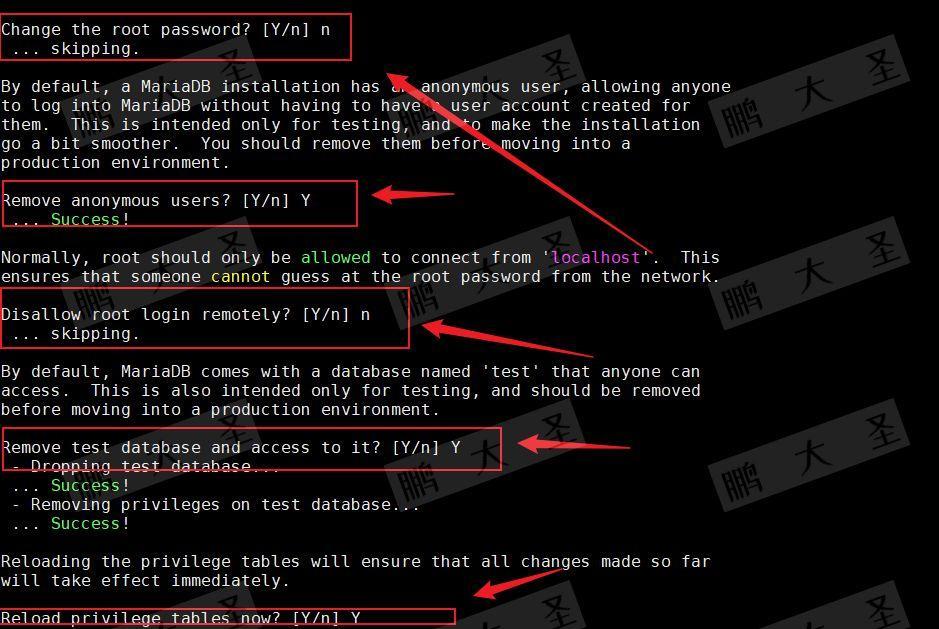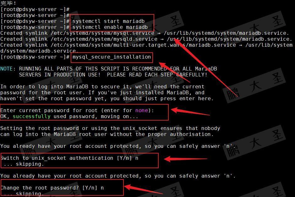 [root@pdsyw-server ~]# systemctl start mariadb [root@pdsyw-server ~]# systemctl enable mariadb [root@pdsyw-server ~]# mysql_secure_installation Enter current password for root (enter for none): Switch to unix_socket authentication [Y/n] n Change the root password? [Y/n] n Remove anonymous users? [Y/n] Y Disallow root login remotely? [Y/n] n Remove test database and access to it? [Y/n] Y Reload privilege tables now? [Y/n] Y [root@pdsyw-server ~]# Switch to unix_socket authentication [Y/n] n
