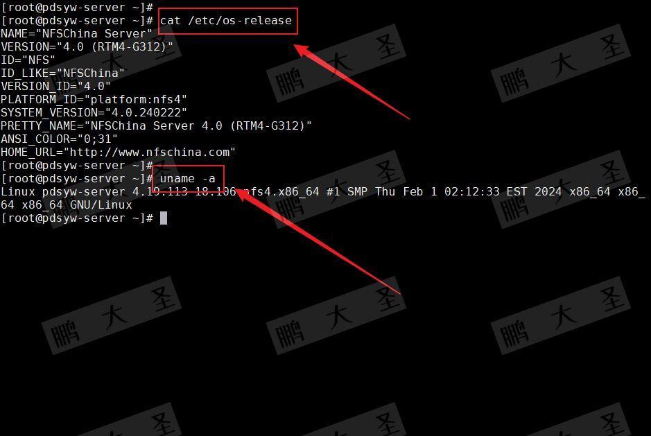 [root@pdsyw-server ~]# cat /etc/os-release NAME="NFSChina Server" VERSION="4.0 (RTM4-G312)" ID="NFS" ID_LIKE="NFSChina" VERSION_ID="4.0" PLATFORM_ID="platform:nfs4" SYSTEM_VERSION="4.0.240222" PRETTY_NAME="NFSChina Server 4.0 (RTM4-G312)" ANSI_COLOR="0;31" HOME_URL="http://www.nfschina.com" [root@pdsyw-server ~]# [root@pdsyw-server ~]# uname -a Linux pdsyw-server 4.19.113-18.106.nfs4.x86_64 #1 SMP Thu Feb 1 02:12:33 EST 2024 x86_64 x86_64 x86_64 GNU/Linux [root@pdsyw-server ~]#
