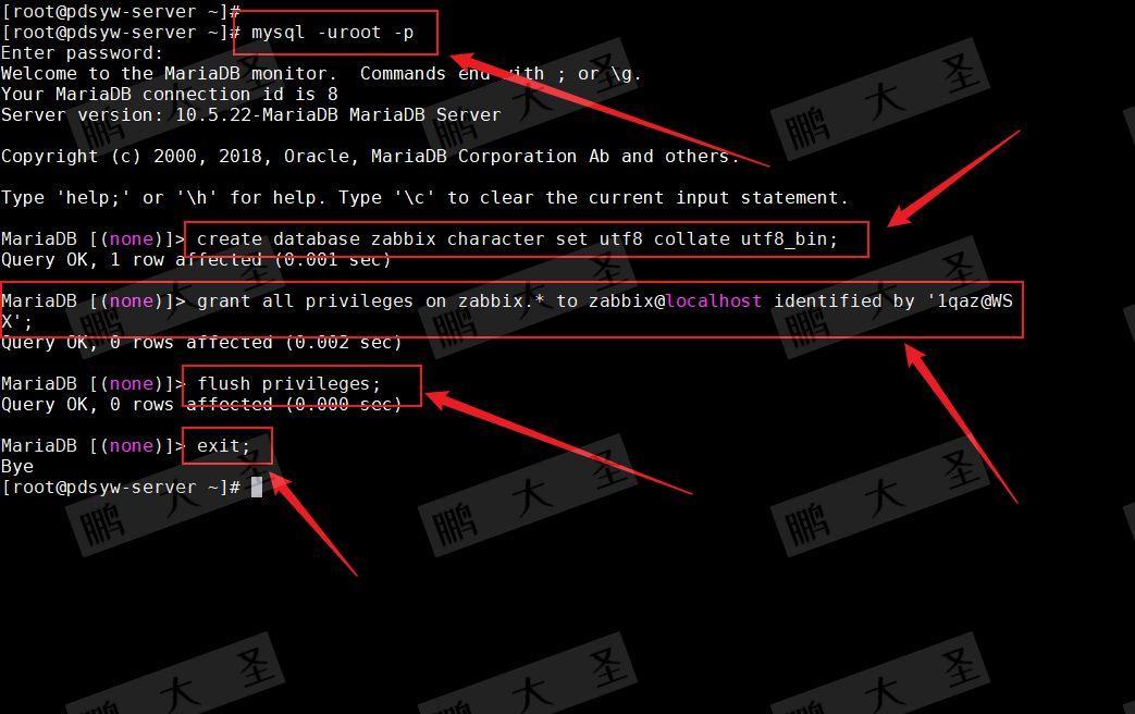 [root@pdsyw-server ~]# mysql -uroot -p Enter password: Welcome to the MariaDB monitor. Commands end with ; or \g. Your MariaDB connection id is 8 Server version: 10.5.22-MariaDB MariaDB Server Copyright (c) 2000, 2018, Oracle, MariaDB Corporation Ab and others. Type 'help;' or '\h' for help. Type '\c' to clear the current input statement. MariaDB [(none)]> create database zabbix character set utf8 collate utf8_bin; Query OK, 1 row affected (0.001 sec) MariaDB [(none)]> grant all privileges on zabbix.* to zabbix@localhost identified by '1qaz@WSX'; Query OK, 0 rows affected (0.002 sec) MariaDB [(none)]> flush privileges; Query OK, 0 rows affected (0.000 sec) MariaDB [(none)]> exit; Bye [root@pdsyw-server ~]#