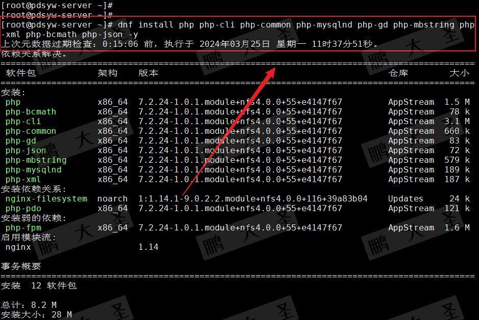 [root@pdsyw-server ~]# dnf install php php-cli php-common php-mysqlnd php-gd php-mbstring php-xml php-bcmath php-json -y