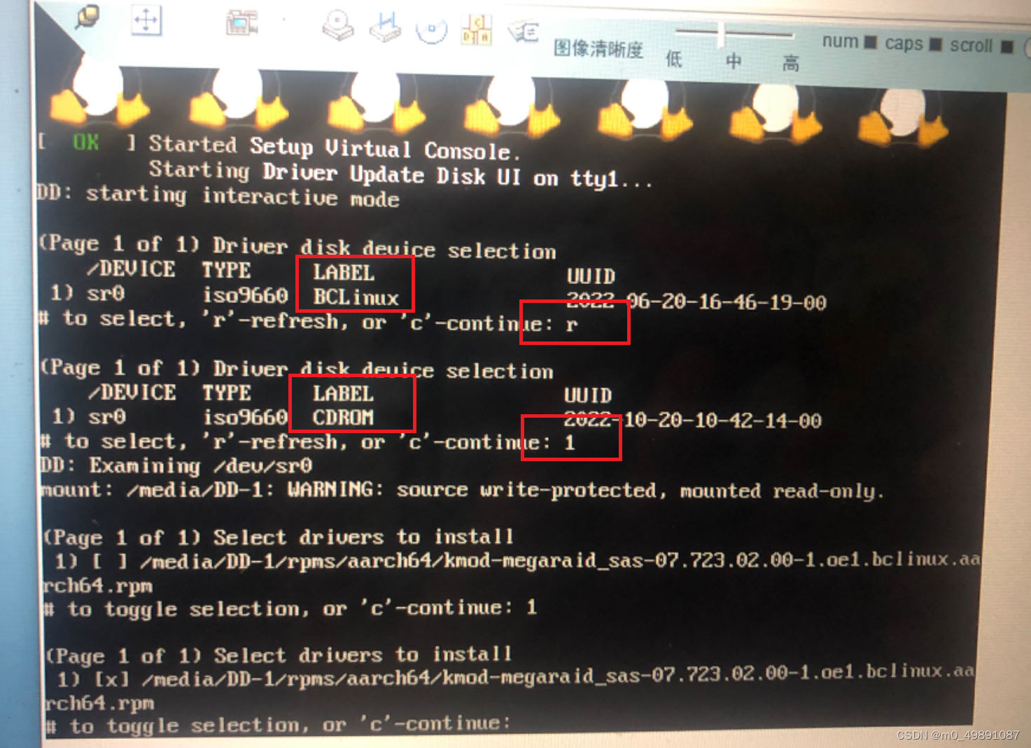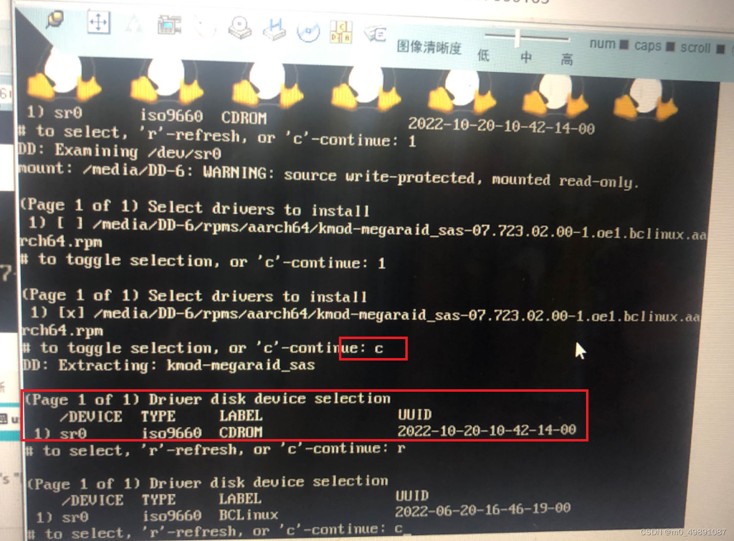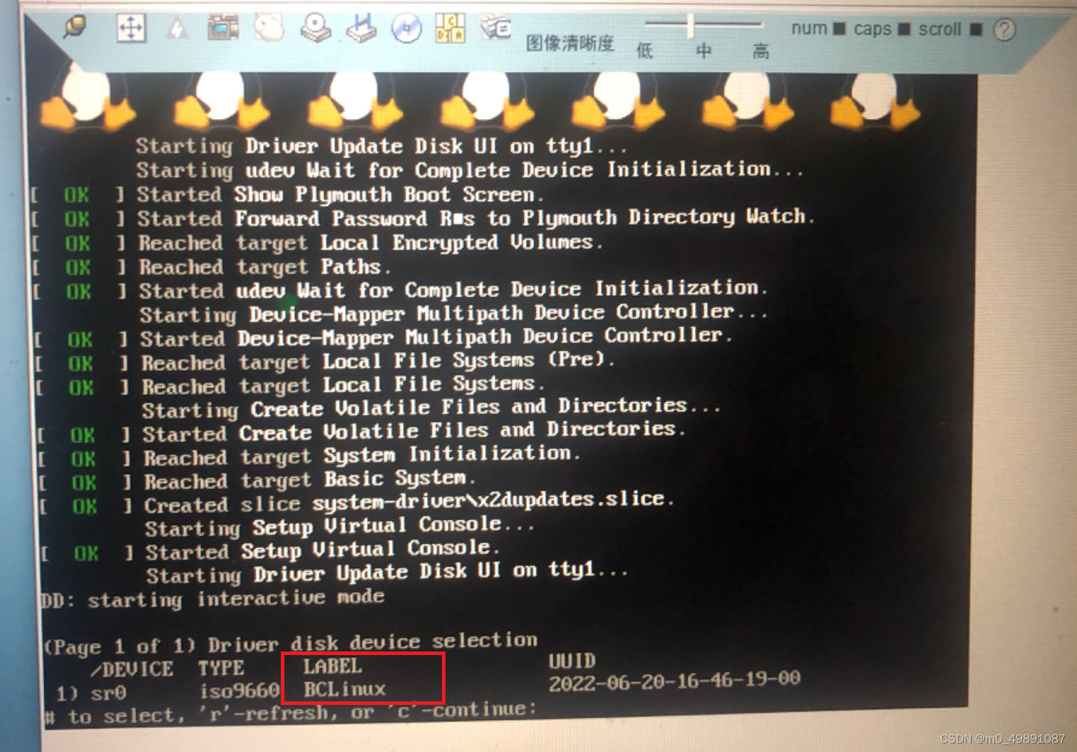1、在如下界面,可以按r键刷新,按c键继续,数字键是选择,当前LABEL 下面显示的是BCLinux说明是操作系统镜像,现在可以更换镜像文件,把操作系统镜像文件更换为RAID卡驱动镜像文件。