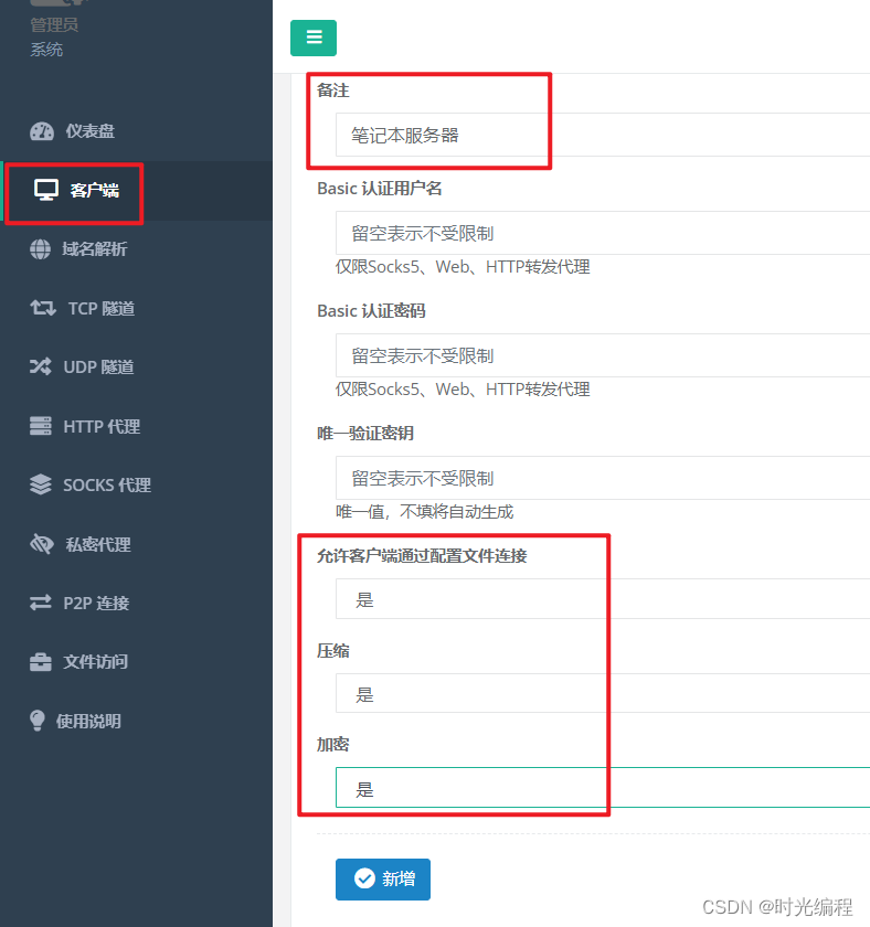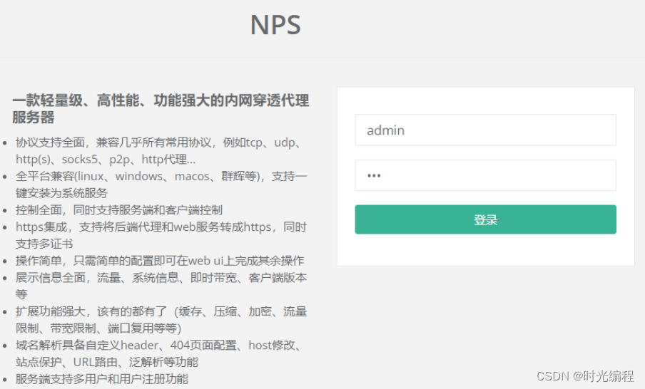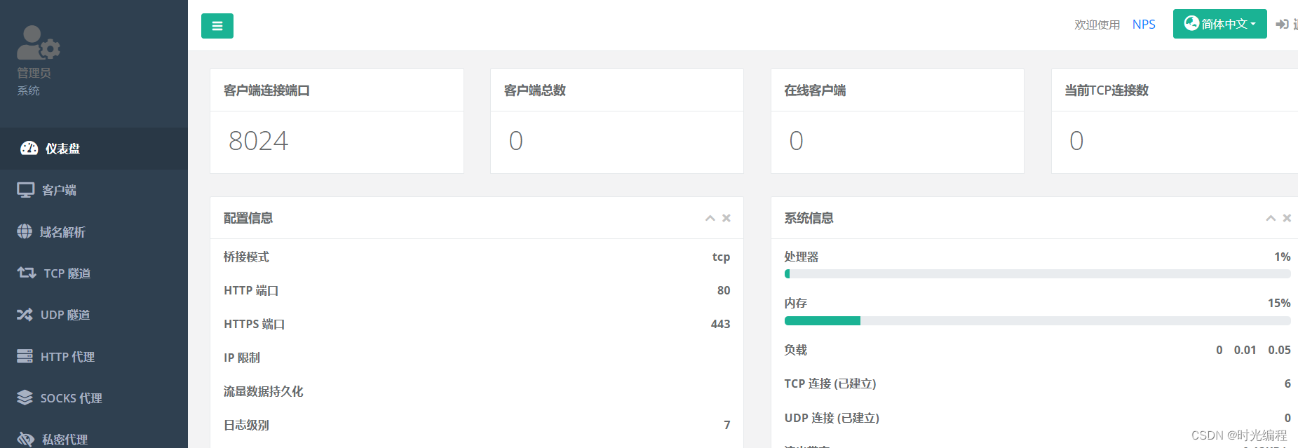 使用用户名和密码登陆(默认admin/123,正式使用一定要更改,修改/etc/nps/conf/nps.conf配置文件中的web_password)