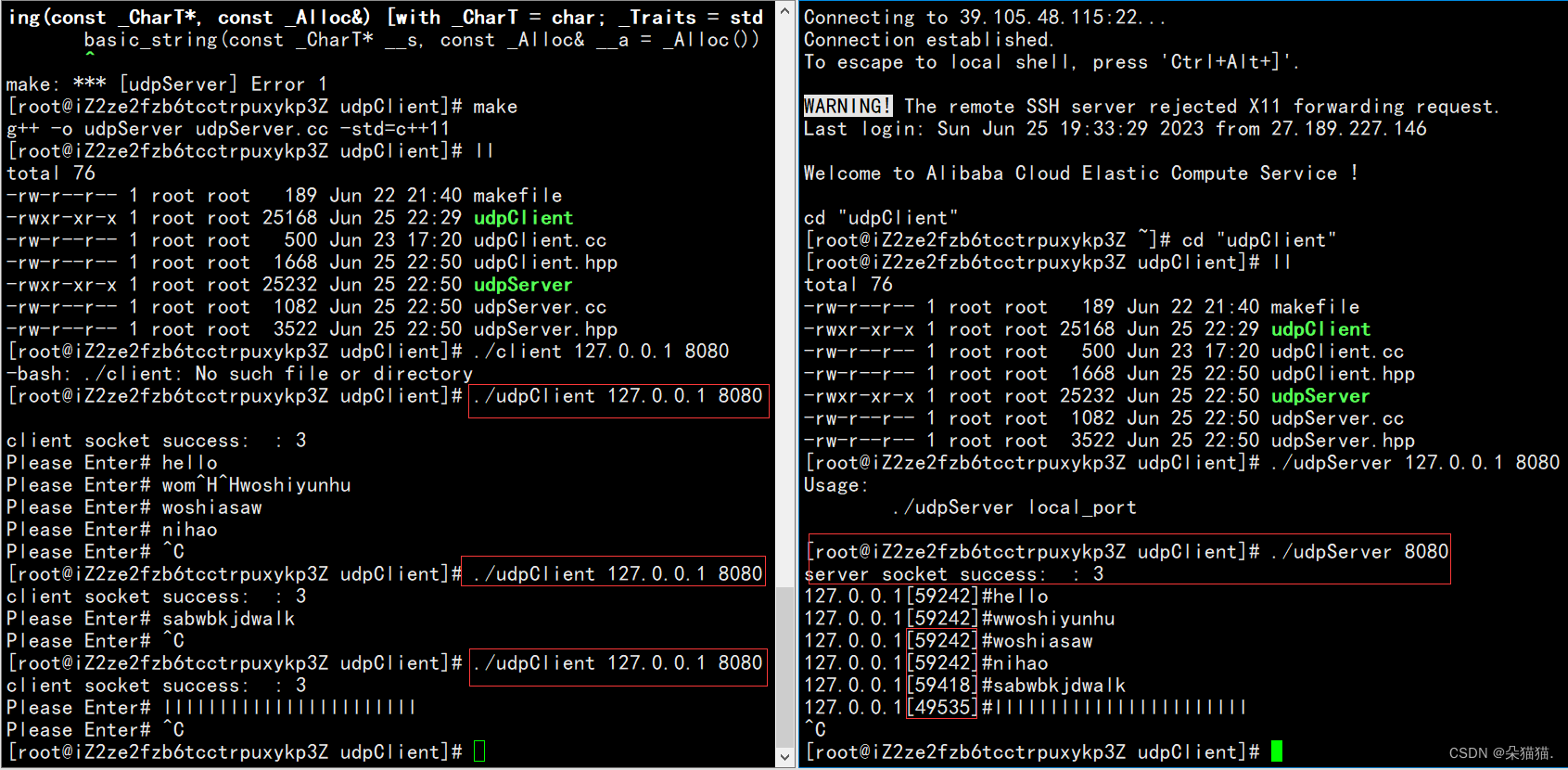 cc=g++ .PHONY:all all:udpClient udpServer udpClient:udpClient.cc $(cc) -o $@ $^ -std=c++11 udpServer:udpServer.cc $(cc) -o $@ $^ -std=c++11 .PHONY:clean clean: rm -f udpClient udpServer 我们通过all就可以创建多个可执行程序了,对于cc这个变量我们设置为g++,以后如果想换其他的编译器就可以直接替换了。