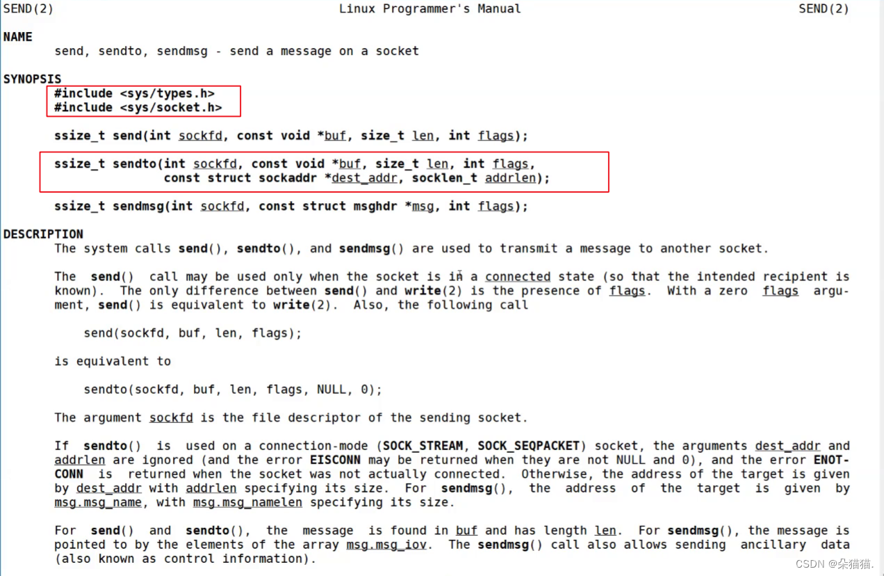 第一个参数是我们创建套接字返回的文件描述符,第二个参数和第三个参数是一起的,buf是我们发送的数据所在的缓冲区,第三个参数是缓冲区的长度,第四个参数是发送方式,我们还是默认填0表示阻塞发送,有数据就发,没数据就等。第五个参数和第六个参数同样是输入型参数,我们客户端需要提前创建一个结构体,向里面填充我们客户端的ip和端口号,然后通过sendto接口发送到服务端,然后服务端就会接收到我们的数据和ip和端口号。