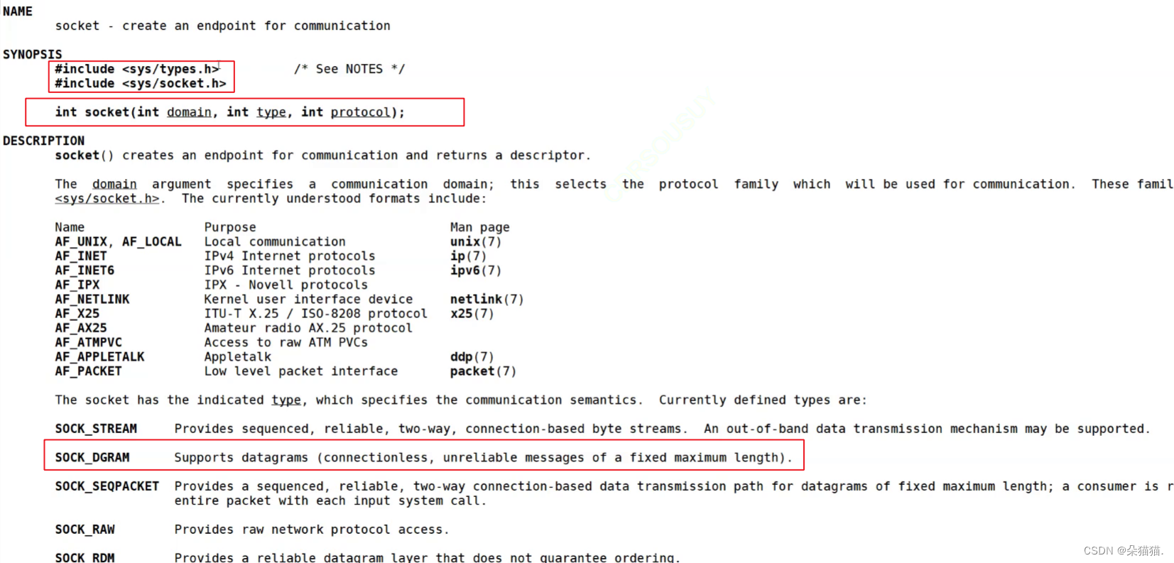 我们现在所写的UDP服务器的特点是不可靠传输无连接,而这正是与SOCK_DGRAM这个选项所匹配的,我们查看这个选项的解释可以看到:DGRAM适用于不可靠传输,连接少
