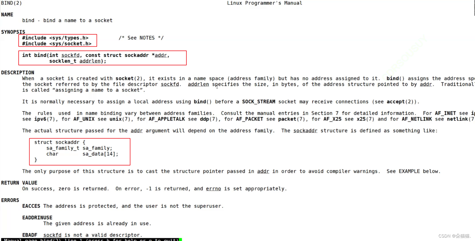 对于bind这个接口,如果成功则返回0,如果失败则返回-1.