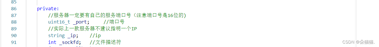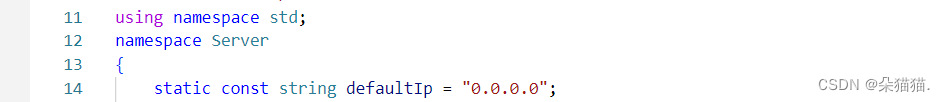 namespace Server { class udpServer { public: udpServer() { } void InitServer() { } void start() { } ~udpServer() { } private: //服务器一定要有自己的服务端口号(注意端口号是16位的) uint16_t _port; //端口号 //实际上一款服务器不建议指明一个IP string _ip; //ip }; } 那么我们现在服务器的ip填多少呢?实际上我们只是完成测试,所以ip就填0.0.0.0就好了,这样的话任意的ip都能访问我们的服务器,所以我们定义一个static变量来保存ip:
