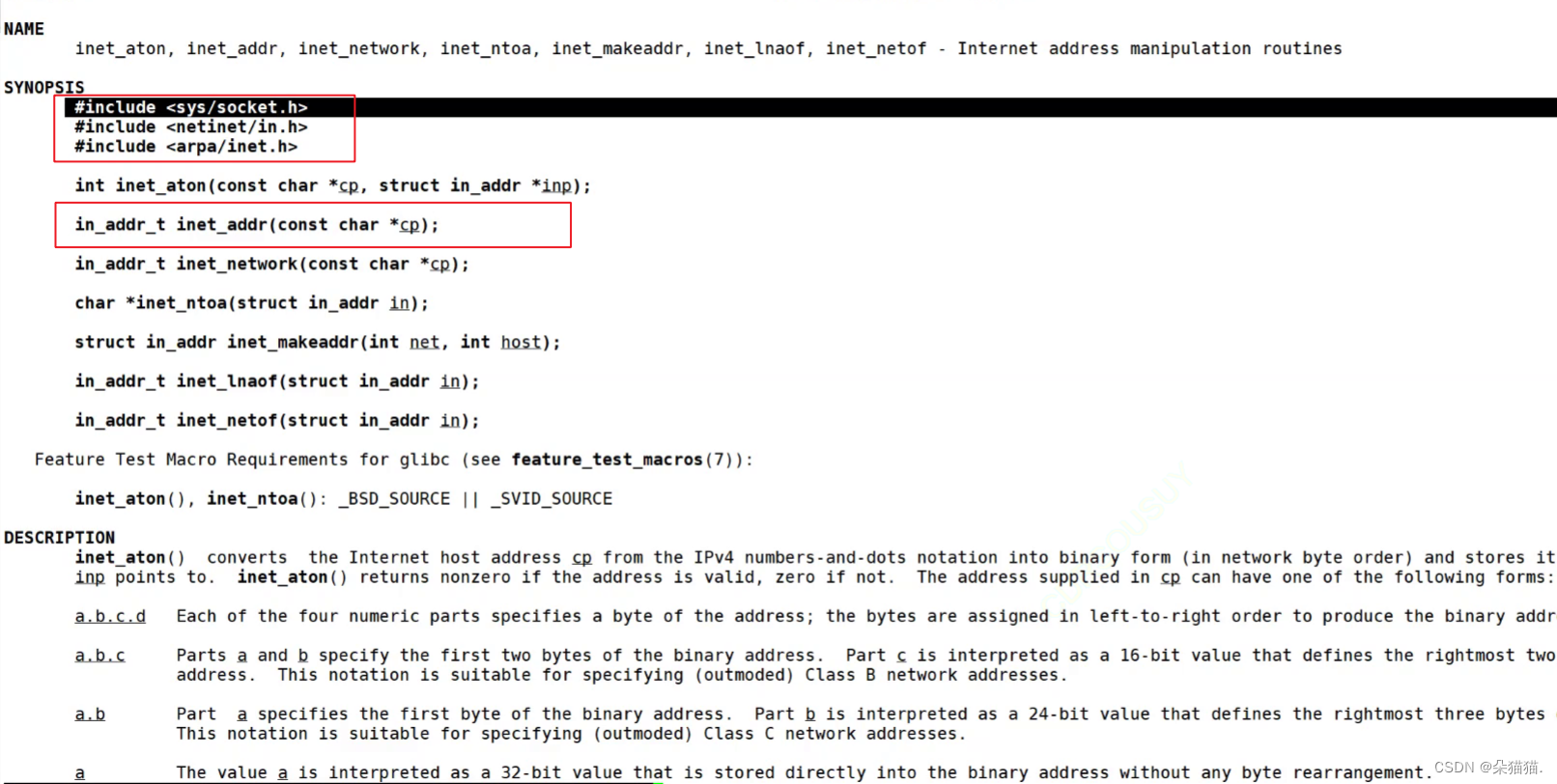 我们可以看到inet_addr的参数是一个const char*类型,这是什么呢?实际上这个类型就是我们ip常用的点分十进制类型,这个函数的返回值是in_addr_t,也就是说这个函数可以直接将点分十进制类型转化为我们结构体中所需要的ip类型。