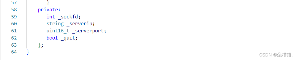 namespace Client { class udpClient { public: udpClient(const string& serverip,const uint16_t &serverport) :_serverip(serverip) ,_serverport(serverport) { } void InitClient() { } void run() { } ~udpClient() { } private: string _serverip; uint16_t _serverport; }; } 前面我们说过,对于服务器而言,ip地址是不重要的,只需要端口号就可以启动服务器,因为一般服务器的IP都是全0,代表任意IP都可以访问,所以我们的客户端只需要随便填一个IP加上特殊的端口号就可以通信了,那么客户端内部ip和port肯定是必须要有的,明白了这个知识我们就先实现一下client.cc的框架: