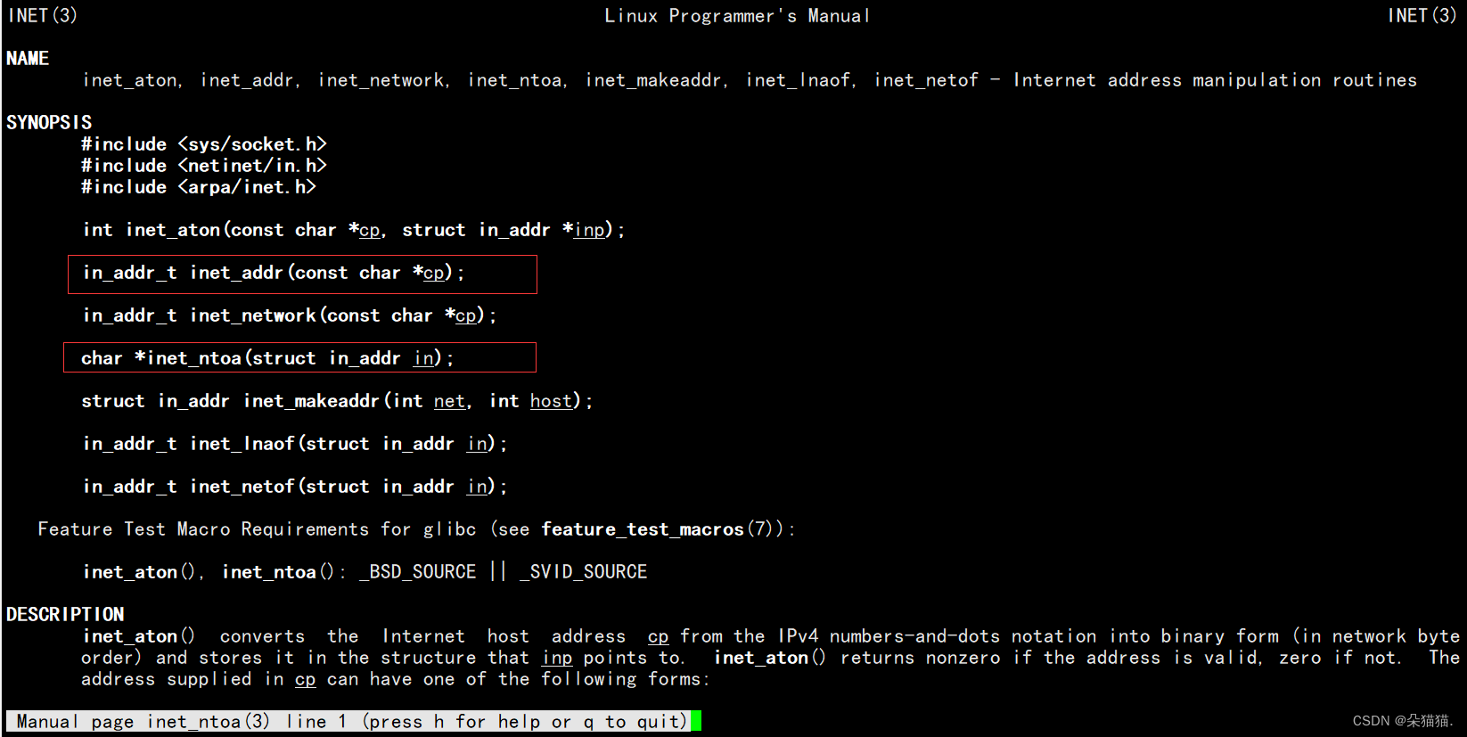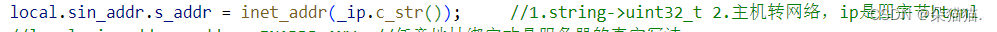对于ip的填充,首先结构体中的ip的类型是32位的,而我们刚刚在类内定义的是一个字符串,所以我们需要先将字符串转换为32位整形,然后再将这个32位整形由主机字节序转化为网络字节序,所以正常的步骤是:1.string->uint32_t 2.htonl(uint32_t) 但是现在我们有一个很好用的接口,这个接口是inet_addr,下面我们看看这个接口: