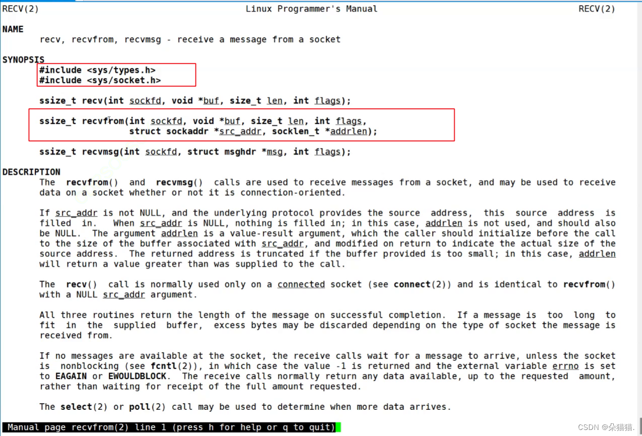 这个接口的第一个参数是我们创建套接字返回的文件描述符,意思就是我们从哪个套接字里读数据。第二个参数是一个缓冲区,第三个参数是这个缓冲区的长度,2和3这两个参数代表的是你读到的数据要放在哪个缓冲区里,第四个参数是读取方式,这里我们默认填0代表阻塞式读取,也就是说客户端不给我们服务端发消息时,我们就一直等待客户端发消息,这就叫阻塞式读取。第五个参数和第六个参数非常重要,这两个参数是输出型参数,也就是说未来客户端给我们发消息时,会将数据放到缓冲区中,然后会将客户端的端口号和IP放到struct sockaddr*这个结构体当中,第六个参数就是这个结构体的长度,我们可以理解为:我们只需要创建一个空的结构体,然后客户端发消息后这个接口就会将客户端的端口号和IP放到我们自己创建的结构体中。