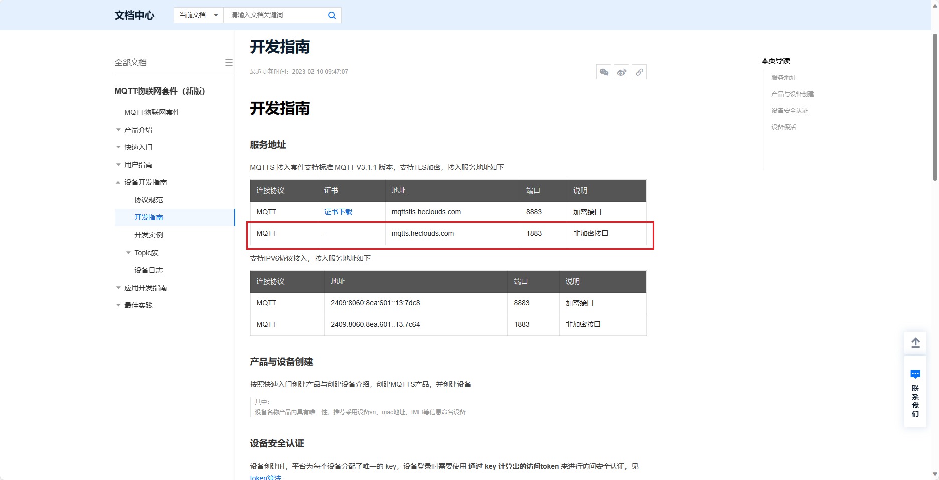 OneNET 服务器地址是 mqtts.heclouds.com : 1883,地址是从 OneNET 文档中心得到的。