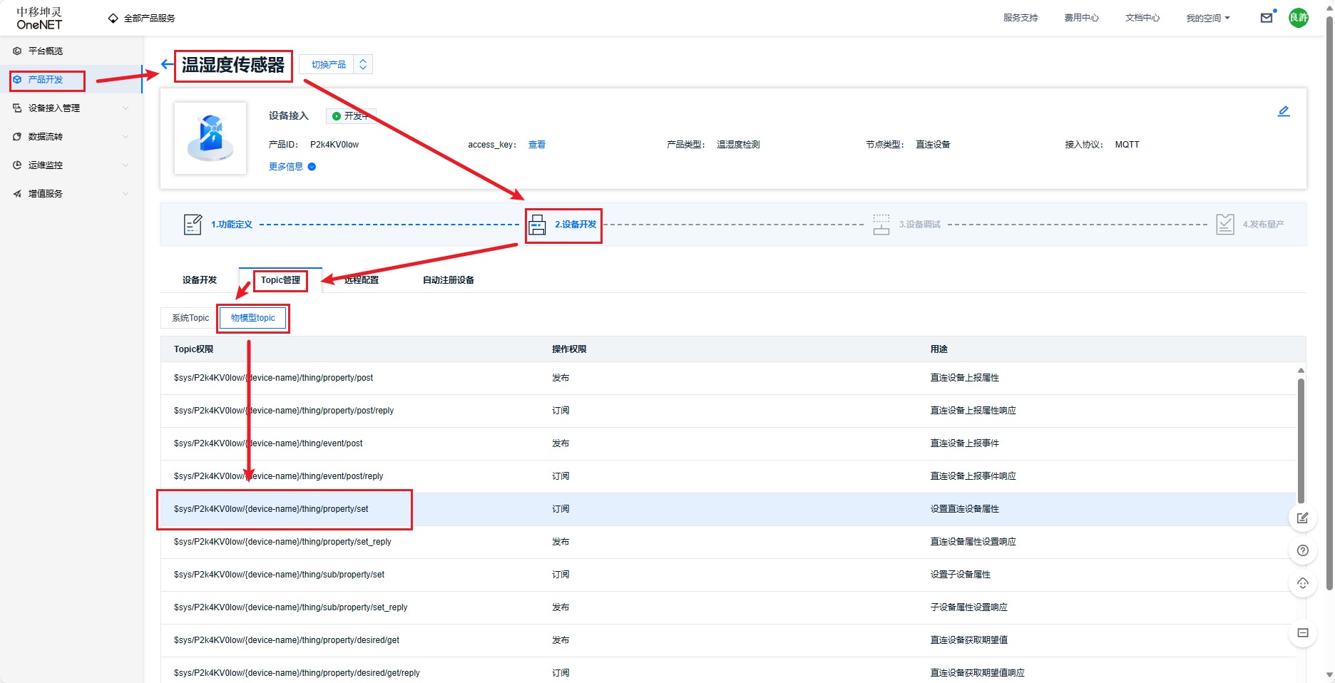 选择设置直连设备属性:$sys/P2k4KV0low/{device-name}/thing/property/set