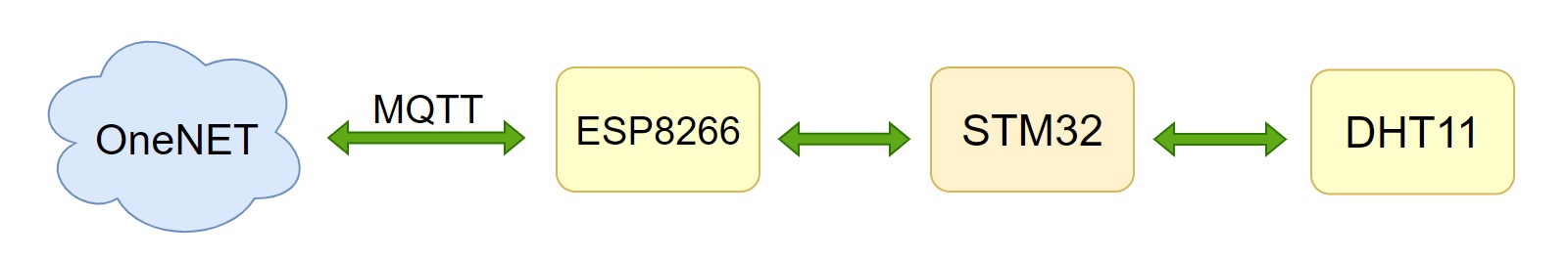 使用 STM32F103C8T6 作主控芯片,配合 DHT11 温湿度传感器,实时监测周围环境的温湿度变化。通过 ESP8266 模块以 MQTT 协议将获取到的温湿度数据通过无线网络连接上传至 OneNET 平台,以便用户可以随时随地通过手机或电脑查看数据。