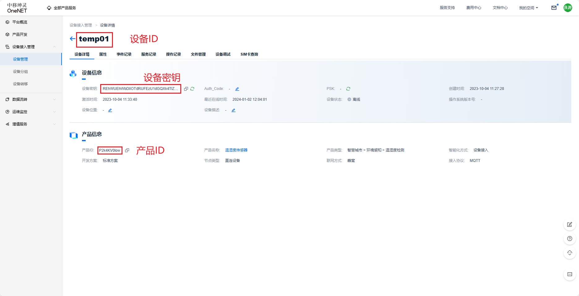 | key | string | MQTT 三元组的设备密钥 | REhWUEhWbDlIOTdRUFEzU1dGQXk4TlZKZ25oQ0N4S3M= |