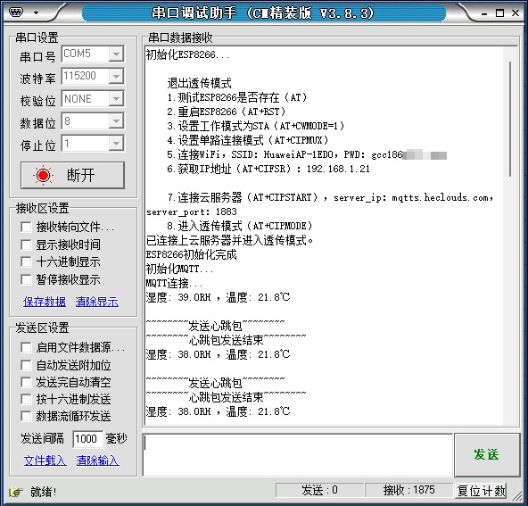 #include "sys.h" #include "usart.h" #include "delay.h" #include "esp8266.h" #include "onenet.h" #include "dht11.h" extern char dht11_data[5]; int main(void) { HAL_Init(); /* 初始化HAL库 */ sys_stm32_clock_init(RCC_PLL_MUL9); /* 设置时钟,72M */ delay_init(72); /* 初始化延时函数 */ usart_init(115200); /* 波特率设为115200 */ printf("初始化ESP8266...\r\n"); esp8266_init(115200); printf("初始化MQTT...\r\n"); mqtt_init(); printf("MQTT连接...\r\n"); mqtt_connect(MQTT_ClientID,MQTT_UserName,MQTT_PassWord); while(1) { uint8_t data_send_buff[512]; memset(data_send_buff, 0, sizeof(data_send_buff)); dht11_read(); sprintf((char *)data_send_buff,"{\"id\":\"1386772172\",\"version\":\"1.0\",\"params\":{\"temperature\":{\"value\":%d.%d},\"humidity\":{\"value\":%d.%d}}}" ,dht11_data[2], dht11_data[3], dht11_data[0], dht11_data[1]); mqtt_publish_data(POST_TOPIC, (char *)data_send_buff, 0); HAL_Delay(3000); //3s发送一次 printf("\r\n~~~~~~~~发送心跳包~~~~~~~~\r\n"); mqtt_send_heart(); printf("~~~~~~~~心跳包发送结束~~~~~~~~\r\n"); } } 烧录好后,串口效果如下: