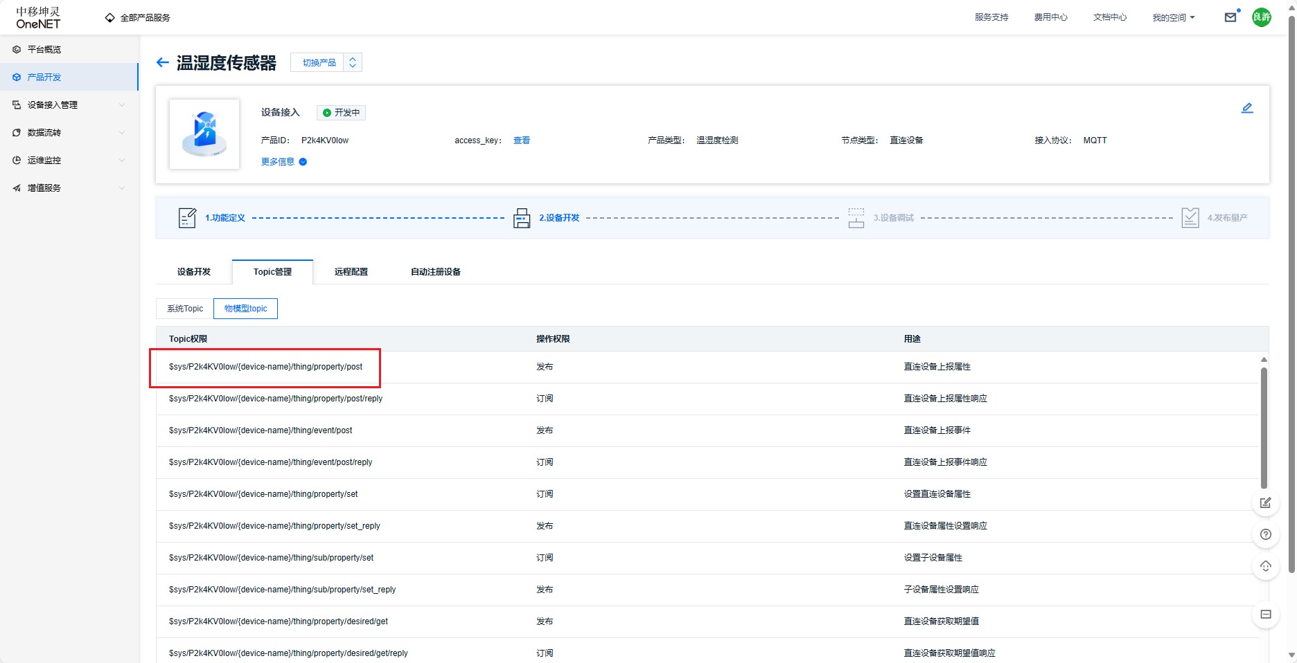 选择直连设备上报属性:$sys/P2k4KV0low/{device-name}/thing/property/post