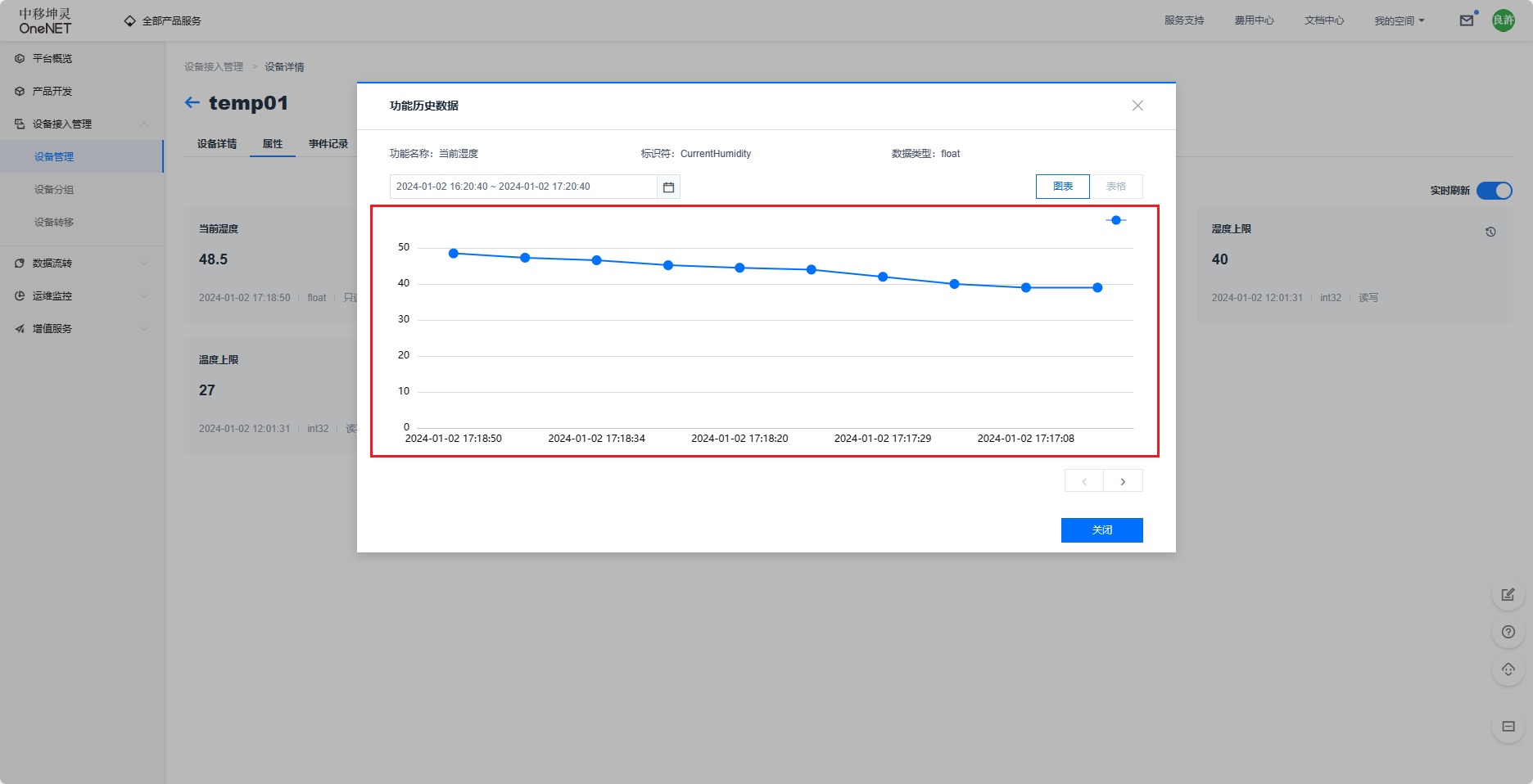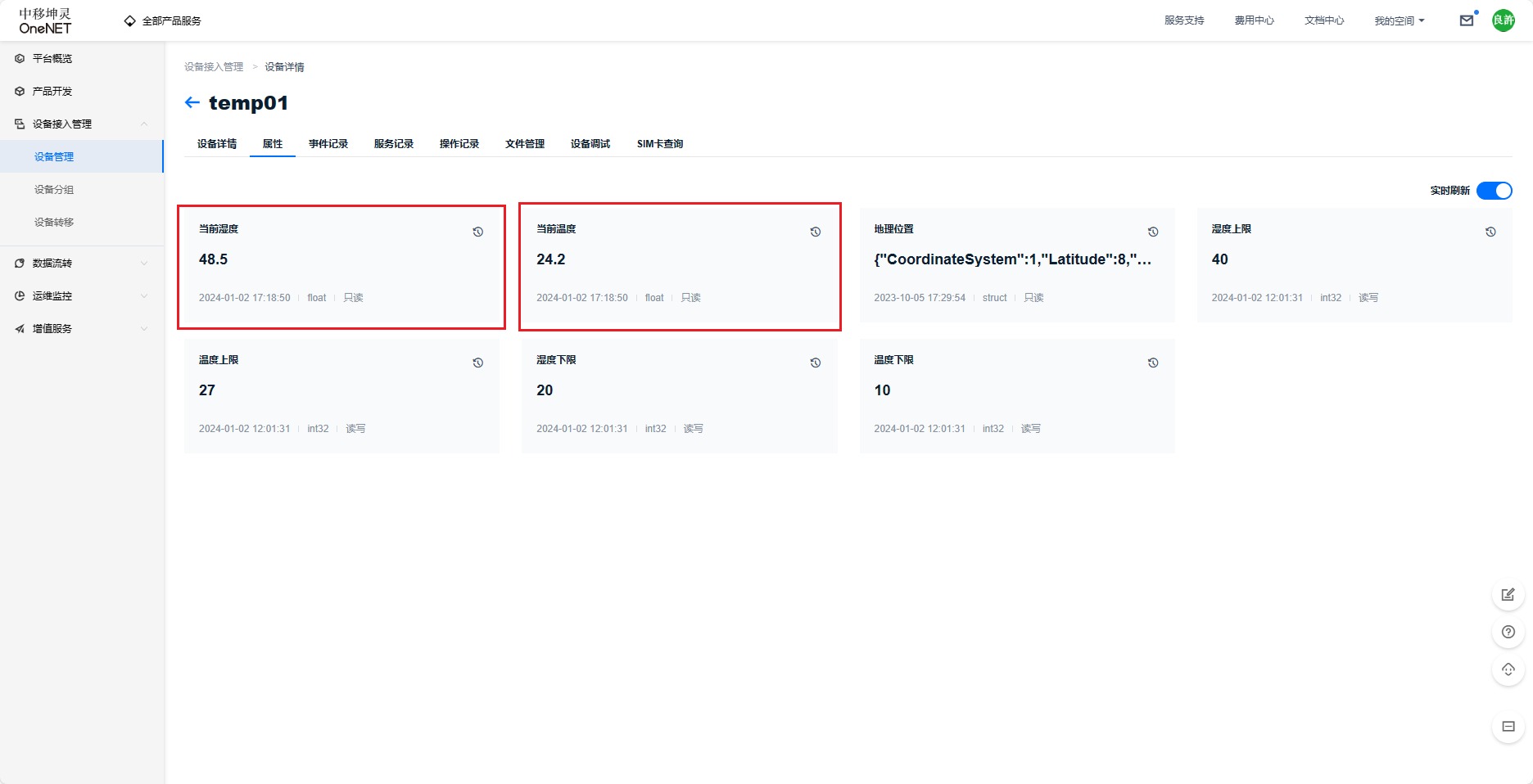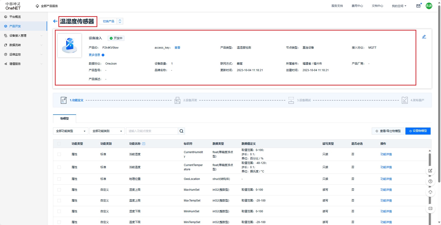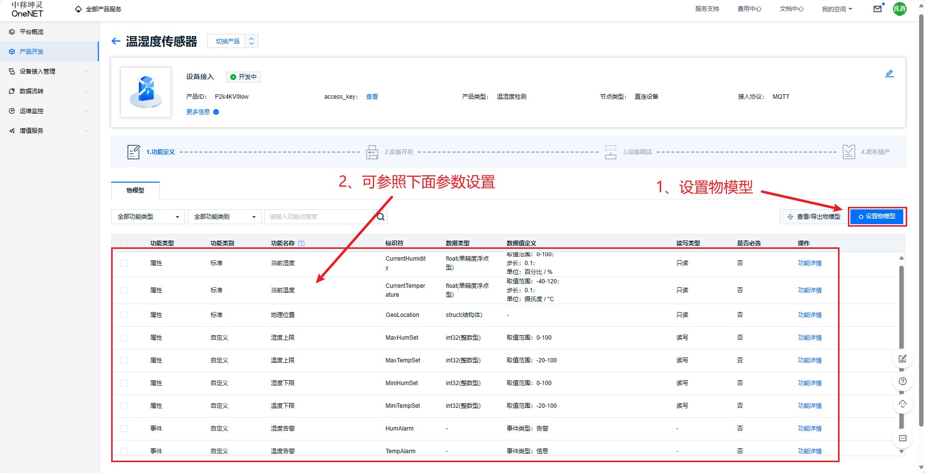 本教程只用到「当前湿度」和「当前温度」,剩下的物模型是下篇教程使用的。