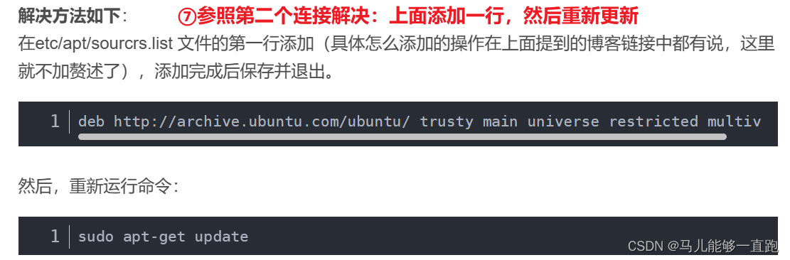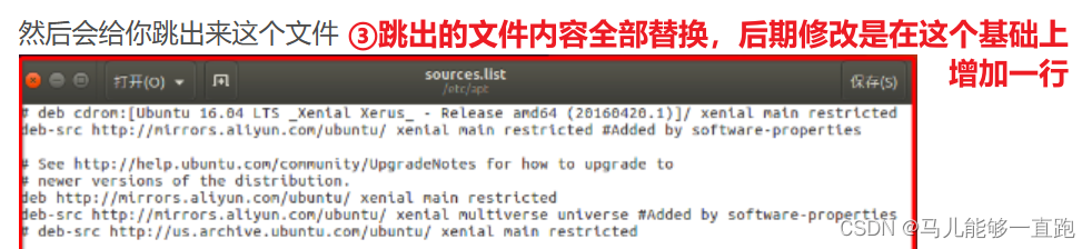1、打开默认源文件 sudo gedit /etc/apt/sources.list 2、在etc/apt/sourcrs.list 文件的第一行添加如下代码段,添加完成后保存并退出。 deb http://archive.ubuntu.com/ubuntu/ trusty main universe restricted multiverse 3、重新更新 sudo apt-get update
