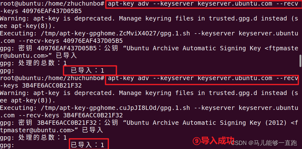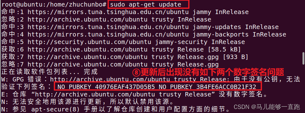 1、输入如下指令导入两个密匙:(密匙号要根据报错的来修改) apt-key adv --keyserver keyserver.ubuntu.com --recv-keys 40976EAF437D05B5 apt-key adv --keyserver keyserver.ubuntu.com --recv-keys 3B4FE6ACC0B21F32