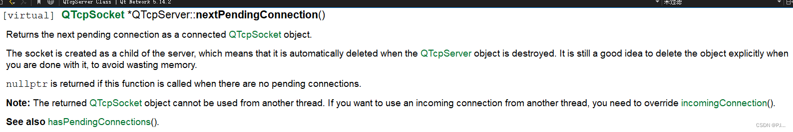 获取到新的连接后,将下一个挂起的连接作为已连接的QTcpSocket对象返回