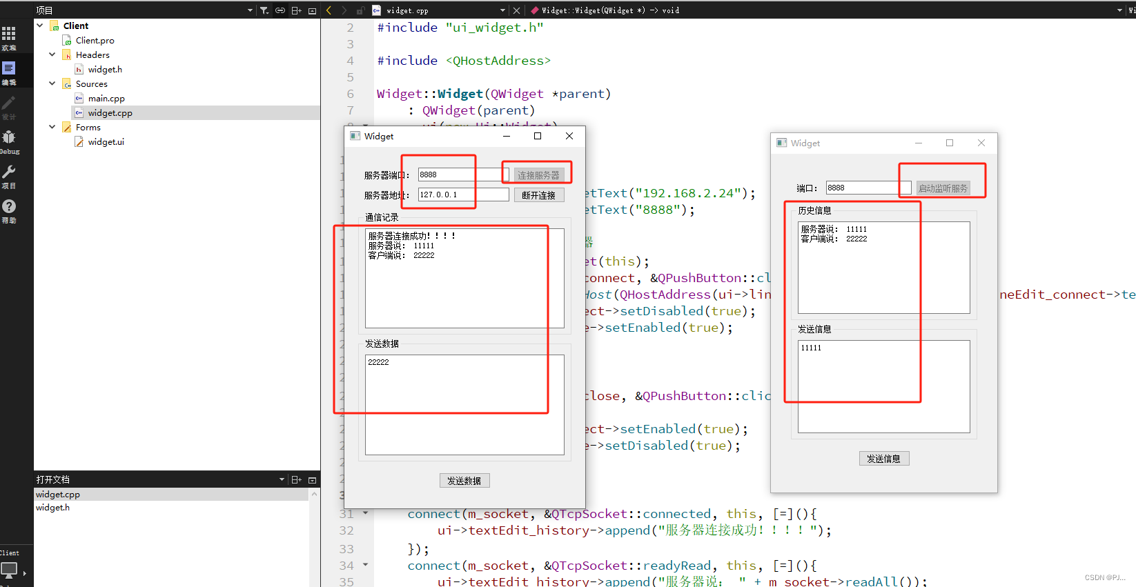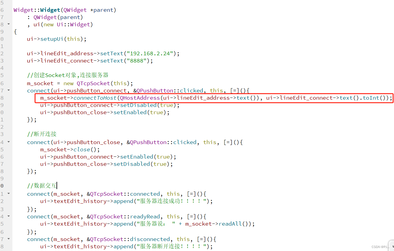 #ifndef WIDGET_H #define WIDGET_H #include #include QT_BEGIN_NAMESPACE namespace Ui { class Widget; } QT_END_NAMESPACE class Widget : public QWidget { Q_OBJECT public: Widget(QWidget *parent = nullptr); ~Widget(); private: Ui::Widget *ui; QTcpSocket *m_socket; }; #endif // WIDGET_H #include "widget.h" #include "ui_widget.h" #include Widget::Widget(QWidget *parent) : QWidget(parent) , ui(new Ui::Widget) { ui->setupUi(this); ui->lineEdit_address->setText("192.168.2.24"); ui->lineEdit_connect->setText("8888"); //创建Socket对象,连接服务器 m_socket = new QTcpSocket(this); connect(ui->pushButton_connect, &QPushButton::clicked, this, [=](){ m_socket->connectToHost(QHostAddress(ui->lineEdit_address->text()), ui->lineEdit_connect->text().toInt()); ui->pushButton_connect->setDisabled(true); ui->pushButton_close->setEnabled(true); }); //断开连接 connect(ui->pushButton_close, &QPushButton::clicked, this, [=](){ m_socket->close(); ui->pushButton_connect->setEnabled(true); ui->pushButton_close->setDisabled(true); }); //数据交互 connect(m_socket, &QTcpSocket::connected, this, [=](){ ui->textEdit_history->append("服务器连接成功!!!!"); }); connect(m_socket, &QTcpSocket::readyRead, this, [=](){ ui->textEdit_history->append("服务器说: " + m_socket->readAll()); }); connect(m_socket, &QTcpSocket::disconnected, this, [=](){ ui->textEdit_history->append("服务器断开连接!!!!"); }); connect(ui->pushButton_send, &QPushButton::clicked, this, [=](){ m_socket->write(ui->textEdit_send->toPlainText().toUtf8()); ui->textEdit_history->append("客户端说: " + ui->textEdit_send->toPlainText().toUtf8()); }); } Widget::~Widget() { delete ui; } 2.2.3 细节讲解