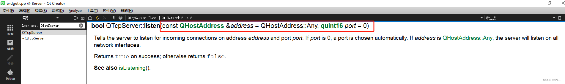 创建服务器对象QTcpServer,对象有监听的方法listen。