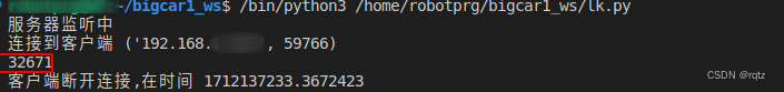 struct.pack('fffffff',self.linear_x,self.angular_z,self.odom_x,self.odom_y,self.odom_z,self.odom_w ,self.yaw ) 'ffffff' 是一个格式字符串,表示要打包的数据类型和顺序,这里我用的全是f,因为每个数据都是float,一个占4字节,一共是4x7=28字节。 H 表示无符号短整数(2字节)f 表示单精度浮点数(4字节)B 表示无符号字符(1字节)self.flag =False:这里的flag作为send_fream函数while循环的条件,初始值为true(在构造函数中写到),同时connect_cserver函数的循环在客户端断开时break,如下,然后就flag=false