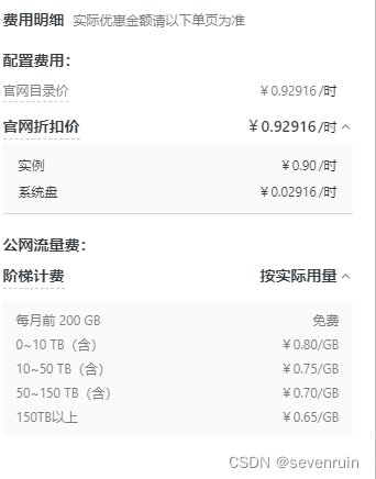 值得一提的是,系统盘费用是不能暂停的,也就是说需要每小时支付0.03,实例的0.9是计算你使用时间的。流量基本上用不到200g,可以白嫖。